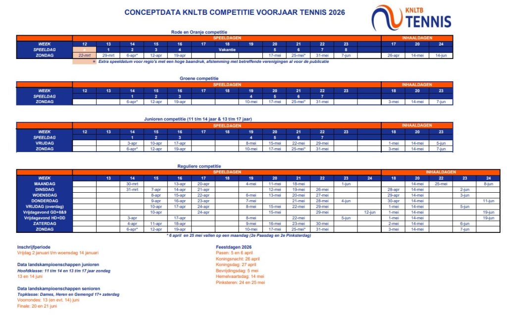 Jullie  kunnen je weer opgeven voor de voorjaars-tennis en / of padel competitie. Hieronder volgt een overzicht wanneer welke competitie gespeeld wordt. Klik hier voor het inschrijfformulier.